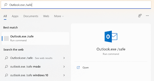 Para iniciar o Outlook no modo de segurança, digite Outlook.exe /safe na caixa de pesquisa e pressione Enter.