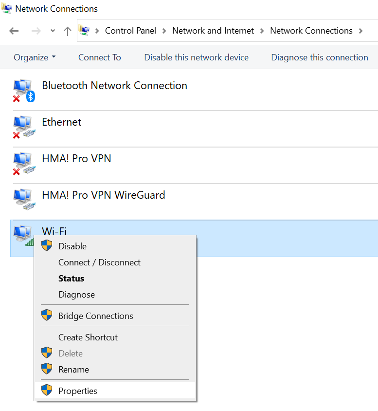 - Clique com o botão direito do mouse na conexão de rede à qual você está conectado e clique em Properties.