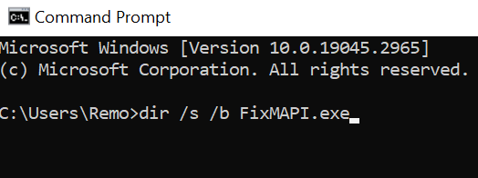 - Na janela Prompt de Comando, navegue até o diretório onde FixMAPI.exe está localizado ou digite o comando “dir /s /b FixMAPI.exe.” Este comando localizará o programa e exibirá sua localização.